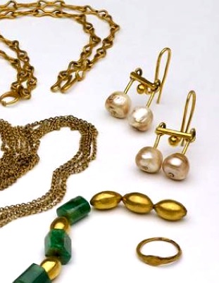 Among the treasures on show at the British Museum’s current Life and Death in Pompeii and Herculaneum exhibition is a cache of jewellery found on a woman fleeing Oplontis, the site of a luxurious villa between Herculaneum and Pompeii. Along with the gold and emerald necklaces were a pair of superb pearl earrings. These kind of pearl earrings were often called crotalia ‘castanets’ because the dangly pearls clicked as they knocked one another. (Pliny Nat. Hist. 9.55) According to Paul Roberts’ brilliant guide to the exhibition, the cheaper freshwater pearls survived in Pompeian tufa (hardened volcanic ash) much better than more expensive seawater pearls.